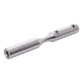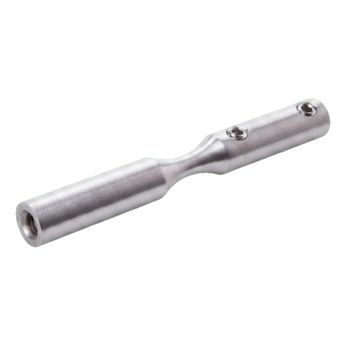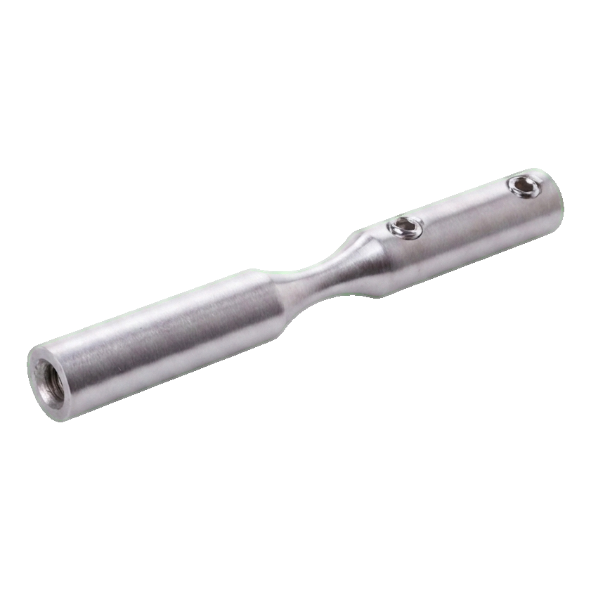 Komponenten tillverkad av rostfritt stål AISI 304 med satinerad finish ger hög korrosionsbeständighet och estetisk, diskret utseende. Montering sker genom skruvning — hållaren är utrustad med M6 gänga och låshål (Ø6 mm), vilket garanterar stabil och hållbar anslutning till vajer och bärkonstruktion.