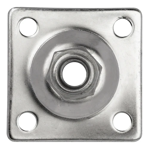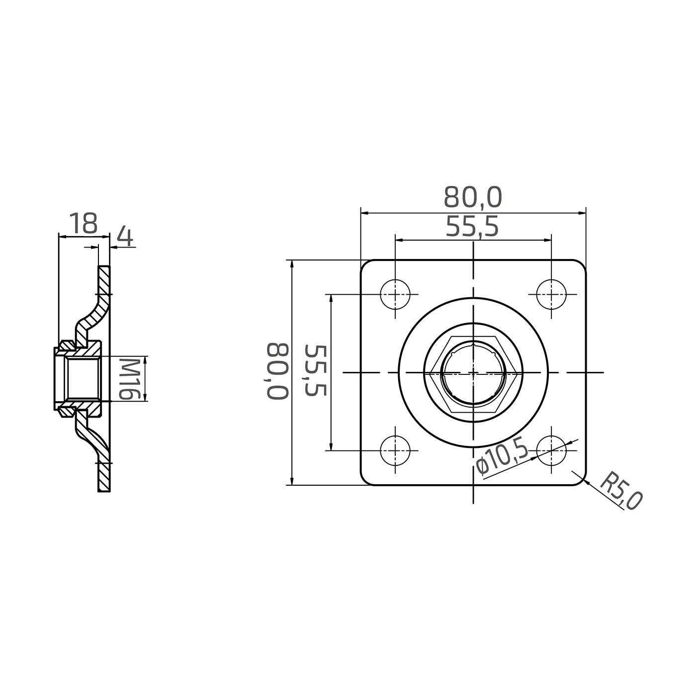 Plattan monteras med fyra skruvar (till hål med diameter ø10,5 mm) direkt till grindstolpe eller konstruktionsram. Centrumavstånd på hålen 55,5 × 55,5 mm möjliggör stabil fördelning av krafter över hela förbindelseytan. I den centrala muttern skruvas axeln för det justerbara gångjärnet med M16-gänga, vilket möjliggör precis justering av grindflygeln position efter montering.