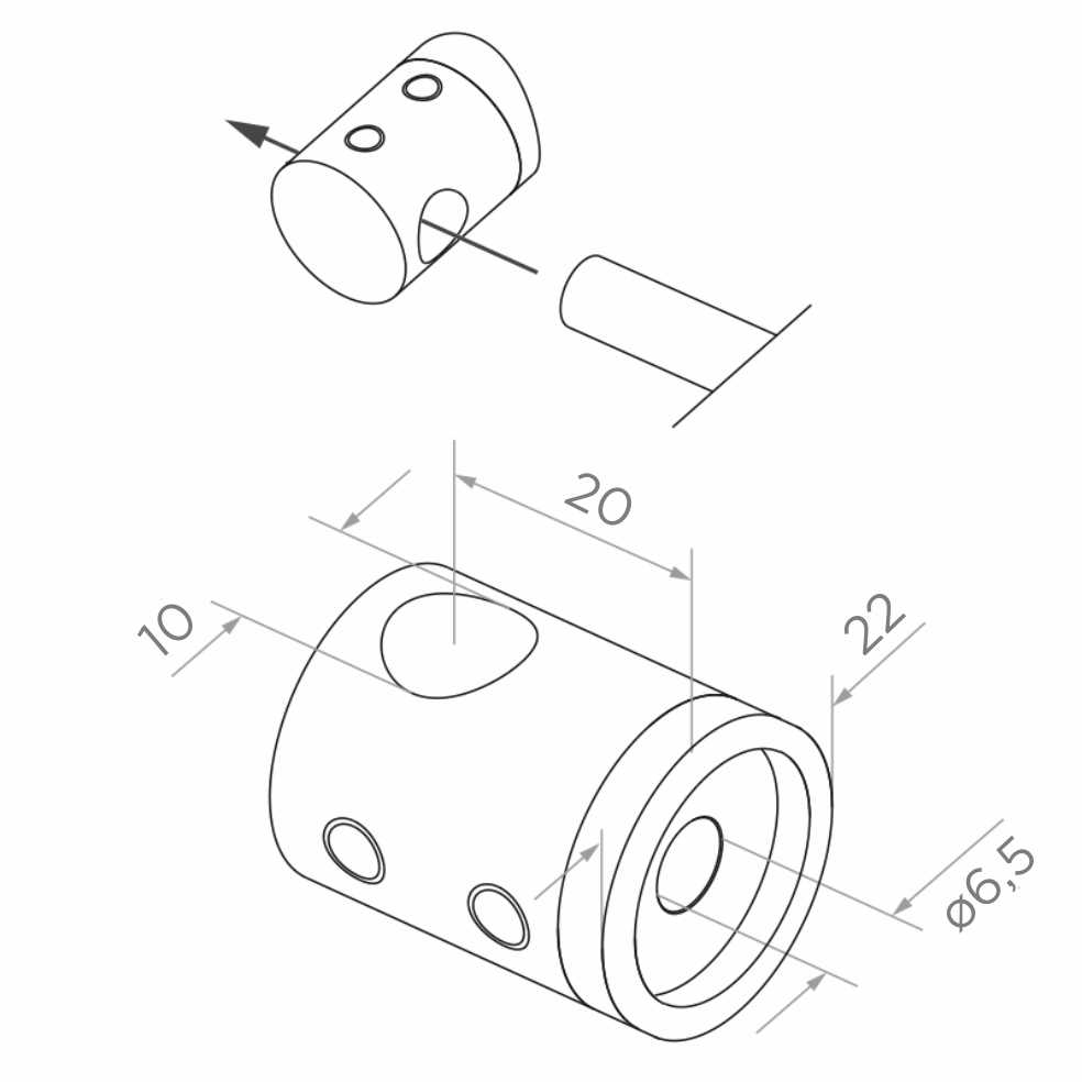 Beslagets kropp har cylinderform med genomgående tvärsnittshål för stång. Monteringshålet i detaljen möjliggör skruvning av beslaget till plan yta (t.ex. stolpe, profil). Monteringsvyn på den tekniska ritningen visar det intuitiva sättet att placera stången i beslaget.