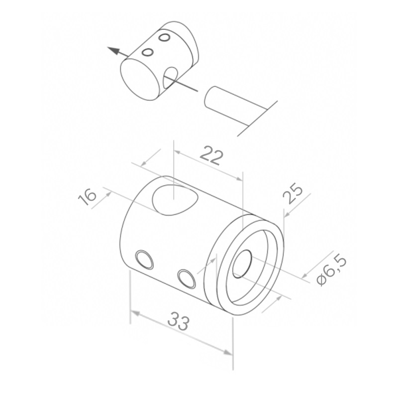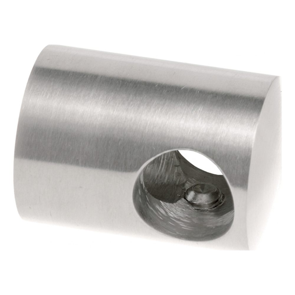 Tillverkat av hållbart rostfritt stål AISI 304 med satinfinish, motståndskraftigt mot korrosion och väderförhållanden. Den cylindriska formen med genomgående hål för stången och monteringshål i basen möjliggör snabb och säker montering till planytan. Sidoskruvar för åtdragning gör det möjligt att låsa stången i fästet utan behov av ytterligare element.