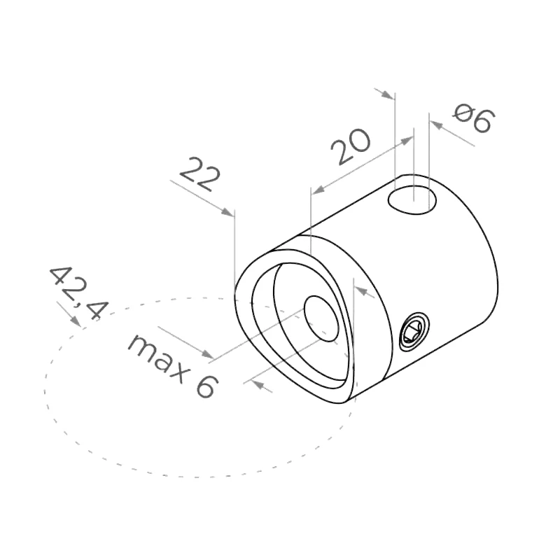 Fästet monteras direkt på balusterstolpe av rör ø 42,4 mm. Den profilerade basen är precist anpassad till rörets krökning, vilket säkerställer stabilt anliggande och estetisk sluteffekt. Stålvajer med diameter upp till 6 mm passerar genom genomgångshålet och den inbyggda klämskruven möjliggör säker och snabb fästning utan behov av ytterligare specialverktyg. Idealisk lösning för monteringsteam som utför rostfria baluster i vajersystem — enkel montering och repeterbar kvalitet på varje objekt.