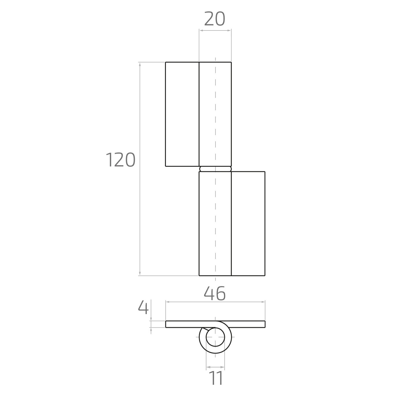 Tvådelad konstruktion med hylsa och tapp säkerställer smidig funktion vid öppning och stängning, och vingarnas tjocklek på 4 mm garanterar hög motståndskraft mot deformation även vid stora belastningar. Gångjärnet levereras i rått tillstånd — det kan korrosionsskyddas (målning, förzinkning) för att anpassa finishen till hela konstruktionen.
