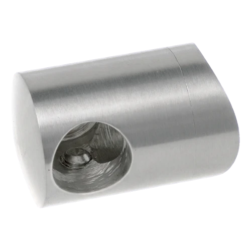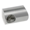 Det cylindriska huset har ett genomgående hål för stång fi 12 mm, två hål för klämskruvar som möjliggör säker låsning av stången samt ett centralt monteringshål fi 6,5 mm för fästning på stolpe. Den bågtformade basen är perfekt anpassad till rörets krökning fi 42,4 mm, vilket säkerställer stabil och tät passform utan behov av ytterligare bearbetning.