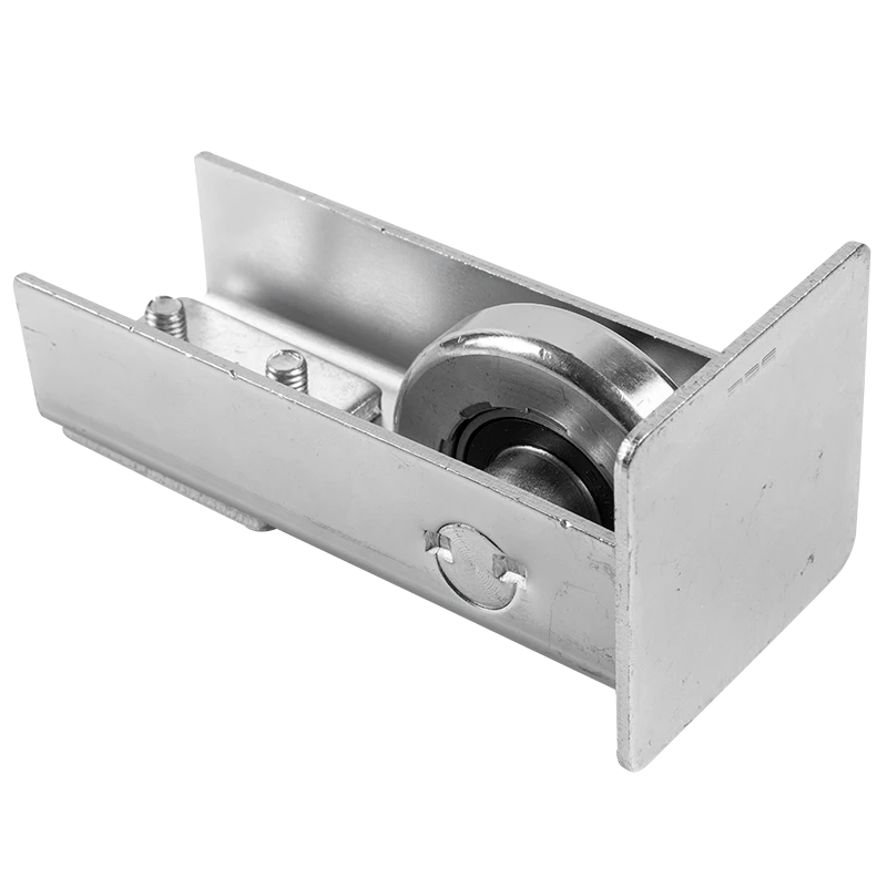 Infartrulle med avslutning PSG är ett galvaniserat stålelement avsett för självbärande skjutgrindar som löper på skena 70×70×4 mm. Monteras i början av skenan, samarbetar med infartsfäste monterat på grindstolpen — när grinden stängs rullar rullen in i fästet, fördelar konstruktionens vikt över fler stödpunkter och stabiliserar effektivt grindflygeln i slutposition.