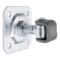 Gångjärnet är avsett för montering på stolpar för flygelgrindar — stål-, mur- eller betongstolpar. Fyra monteringshål i plattan (Ø 10,5 mm) möjliggör säker fastskruvning till underlaget med lämpliga skruvar eller förankringar. Efter fastsättning av plattan på stolpen och ögat på grindflygeln räcker det att dra åt justeringsmuttern på M20-gängan för att ställa in önskad flygelposition. Justeringen kan upprepas flera gånger — detta är särskilt användbart på vintern, när metall krymper under låga temperaturer, och på sommaren, när det expanderar termiskt.