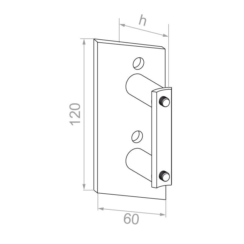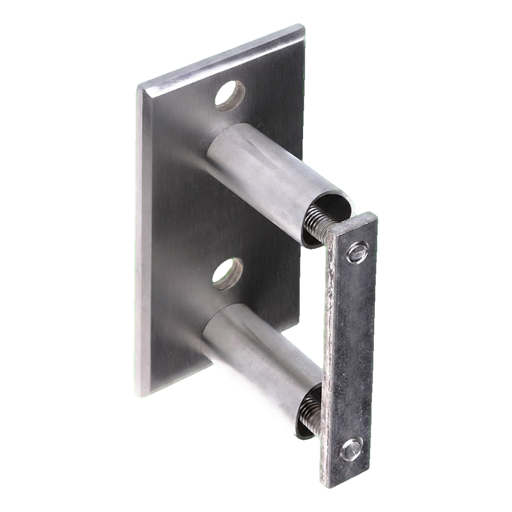 Fästet är avsett för väggmontage — den rektangulära plattan med monteringshål skruvas direkt till väggen, och två cylindriska distanser säkerställer att stoppet flyttas ut från ytan med 50 mm. Konstruktionen möjliggör snabb och säker montage på både murade och betongväggar. I förpackningen finns 1 styck fäste.
