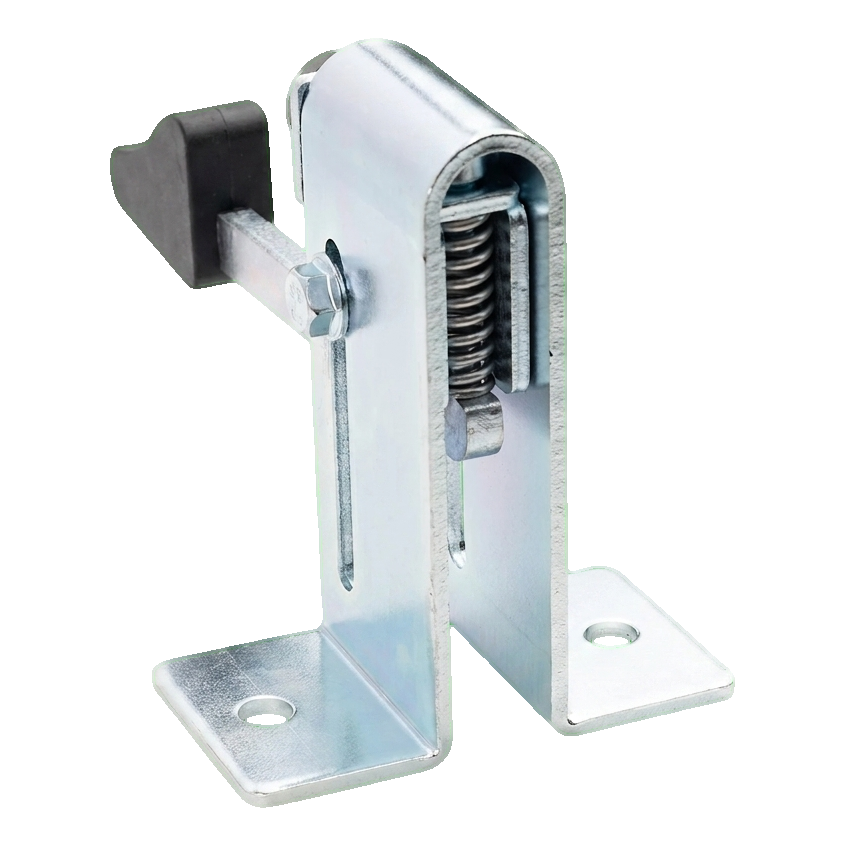 Den inbyggda tryckfjädern låser automatiskt stoppets arm i upplyft position. För att frigöra låsningen räcker det att trycka på stiftet — ett enkelt och intuitivt betjäningssystem som inte kräver ytterligare verktyg. Solid konstruktion av galvaniserat stål säkerställer korrosionsbeständighet och mångårig drift även under svåra väderförhållanden.