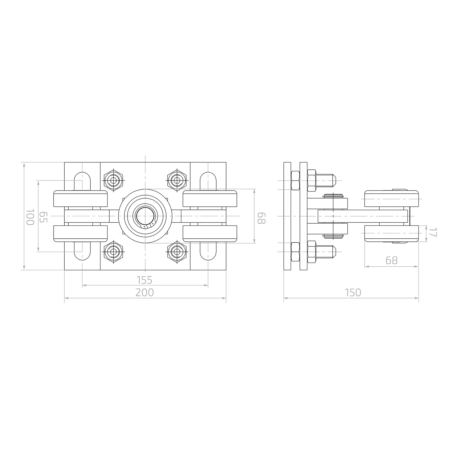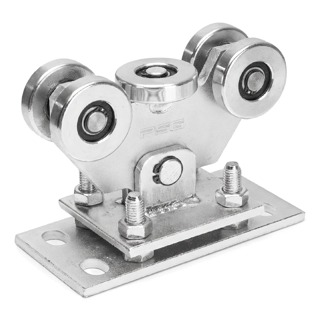 Löpvagnen är utrustad med 5 metallrullar, varav en horisontell rulle som stabiliserar grindstyrningen. Pendelkonstruktion – vagnen är ansluten till basen via en tapp, vilket gör att den automatiskt anpassar sig till skjutgrindens skena. Höjdjustering sker med skruvar, vilket möjliggör exakt nivåinställning av grinden vid montering.
