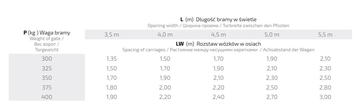 Korrekt centrumavstånd mellan löpvagnarna beror på grindens vikt och grindöppningens ljusmått. Nedanstående tabell underlättar valet: