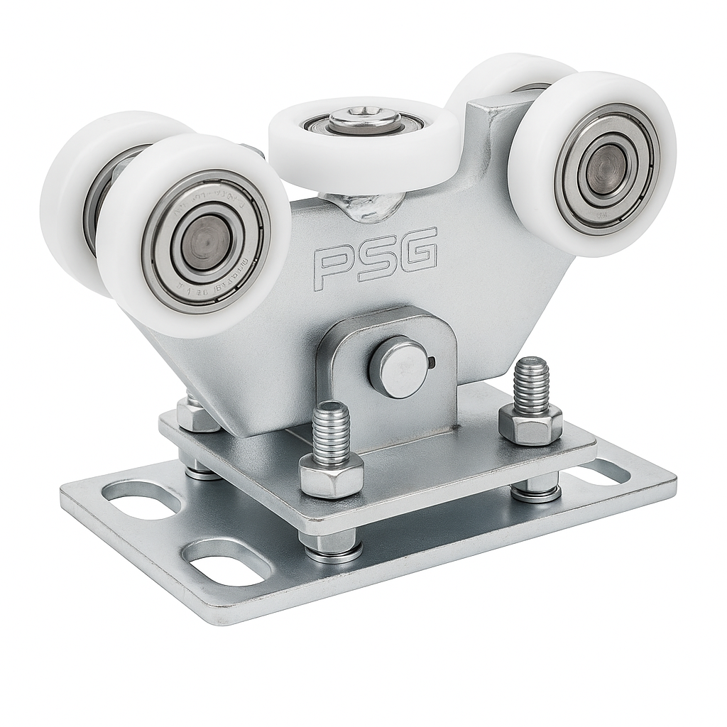 Löpvagnen är utrustad med 5 rullar av plast, varav en horisontell rulle, som säkerställer smidig och tyst grindrörning. Svängbar konstruktion — vagnen är ansluten till basen via en tapp, vilket gör att den automatiskt anpassar sig till skenans profil. Höjdjustering med hjälp av skruvar möjliggör exakt inställning av grindnivån. Vagnen är avsedd för skenor 70×70×4 mm. Hela konstruktionen är tillverkad av galvaniserat stål, vilket garanterar korrosionsbeständighet och lång livslängd utomhus.