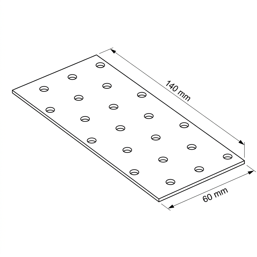 Perforerad platta 140×60 mm är en universell platt förbindare avsedd för konstruktionsförband där sidoytorna på de sammanfogade elementen befinner sig i samma plan. Tack vare 21 hål jämnt fördelade över hela ytan möjliggör plattan både enkla och komplexa förband i träkonstruktioner.