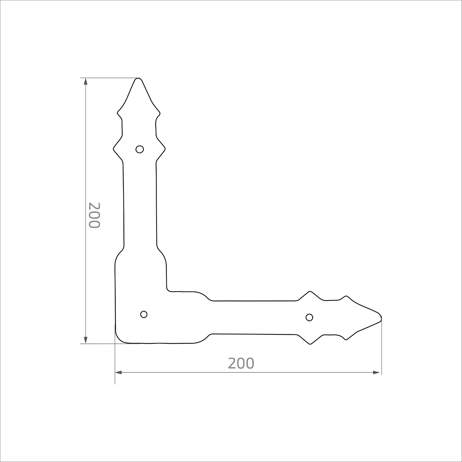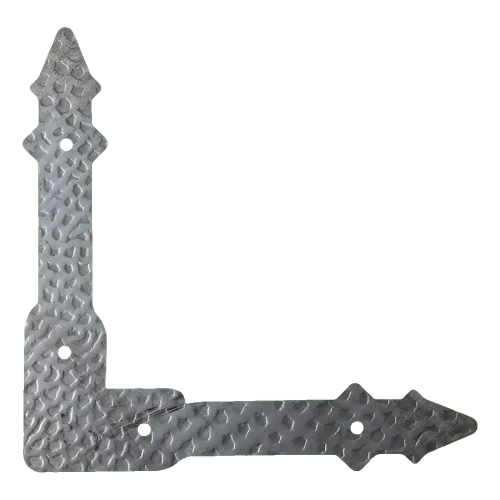 Stålförstärkning för hörn 200×200 mm från Postal är ett dekorativt beslag avsett för förstärkning och förstyvning av hörn på grindar, portar och dörrar. Tack vare den dekorativa hammarstrukturen och karakteristiska avslutningar i form av spetsar kombinerar elementet konstruktiv funktion med estetik — den passar perfekt i stilisering av smidda grindar och staket i rustik stil.