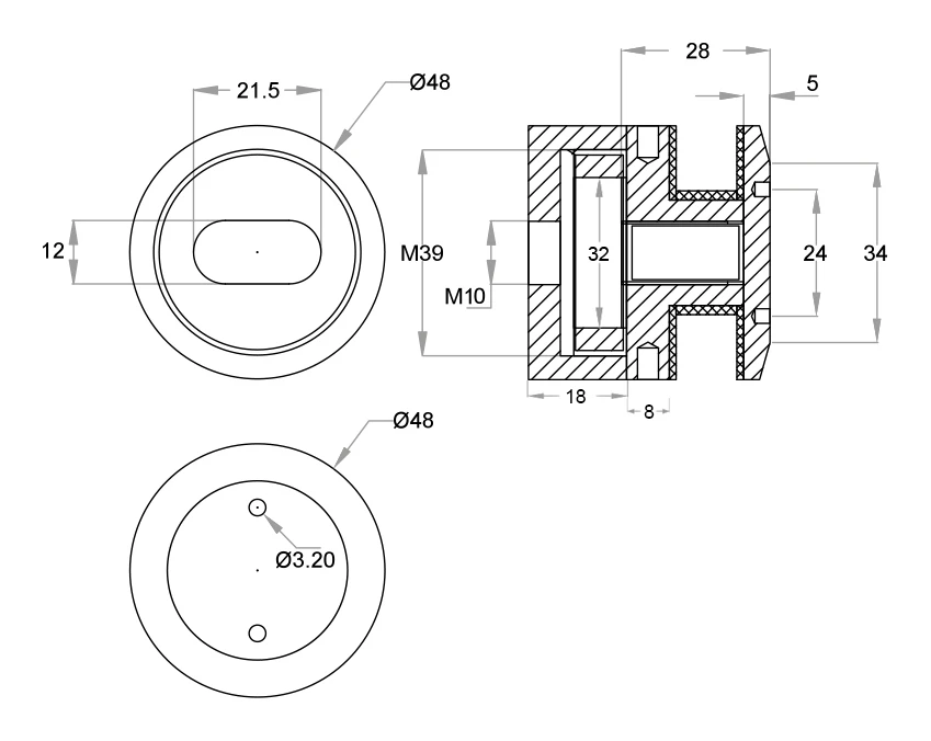 Fästet består av monteringsbas med invändig gänga M10 (fästs till bärkonstruktion) samt tryckskruv som skruvas på gänga M39, som pressar glaset genom gummitätningar. Monteringshålet i basen har bönform (21,5 × 12 mm), vilket möjliggör positionsjustering vid montering. Basens invändiga diameter är 32 mm, och centrumavståndet för nyckelöppningarna i tryckskruven — 24 mm.