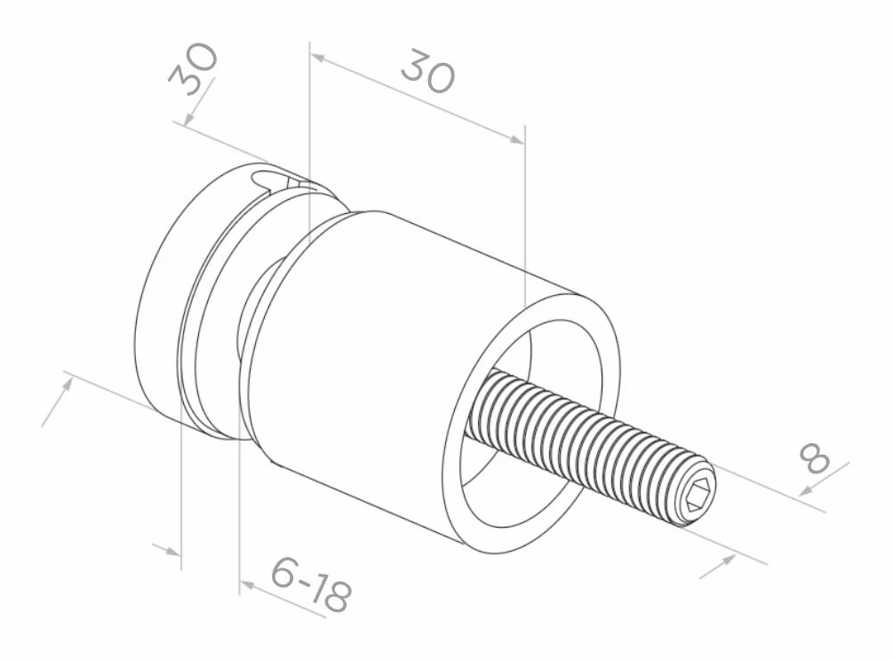 Punktfäste för glas i rostfritt stål AISI 304 med satinfinish — ett robust monteringselement avsett för infästning av glasskivor med tjocklek från 6 till 18 mm på plana ytor. Den precisionsdrejda kroppen med diameter 30 mm och gänga M8 ger en säker och hållbar infästning av glaspaneler både inomhus och utomhus.
