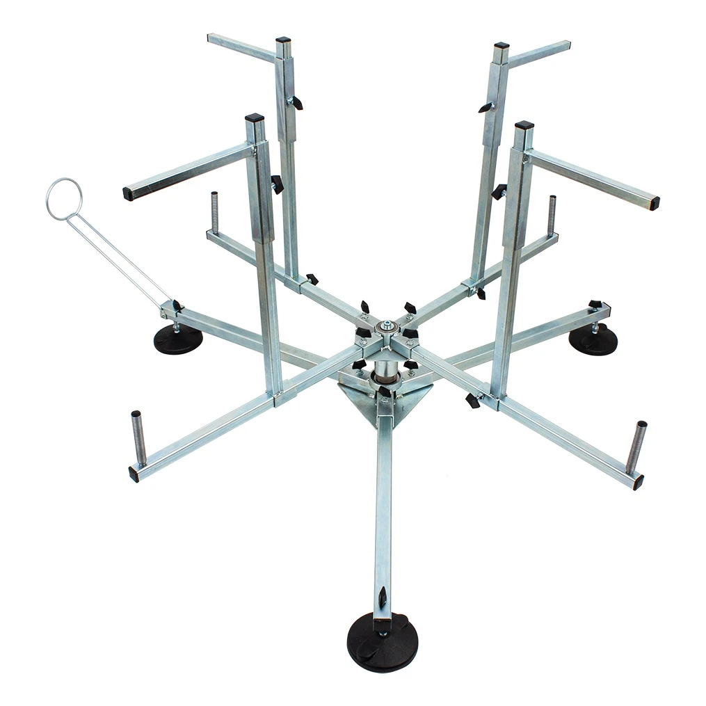 Konstruktionen är tillverkad av högkvalitativa förzinkade stålprofiler, vilket garanterar lång hållbarhet även vid intensiv användning på byggarbetsplatser. Den stabila stjärnformade basen med justerbara fötter ger ett säkert stöd på alla underlag.