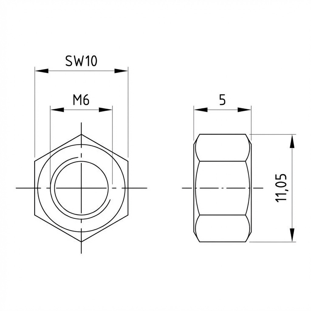 Överensstämmelse med DIN 934-standarden innebär en standardiserad sexkantig form som möjliggör enkel åtdragning med vilken standardnyckel som helst. Muttern är återanvändbar och passar alla metriska M6-skruvar med högergänga.