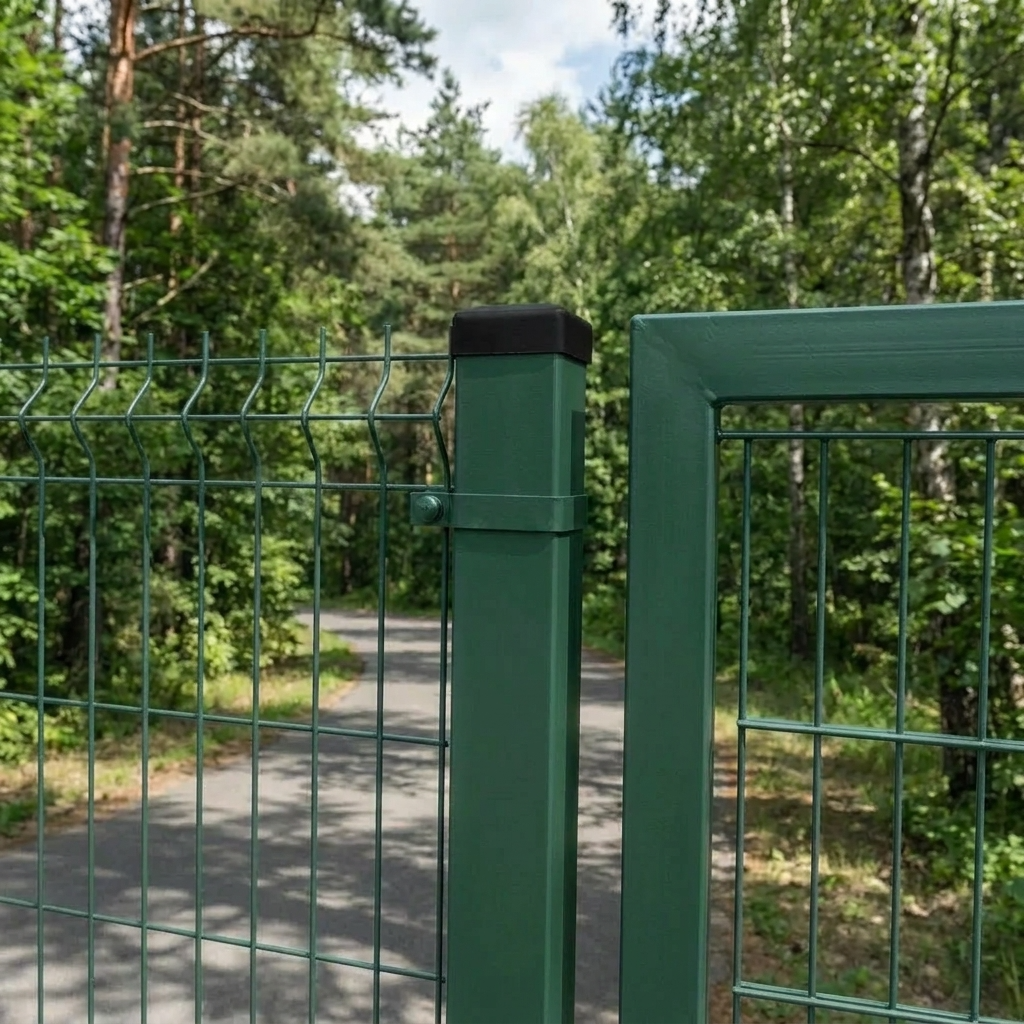 Fyrkantig profil med tvärsnittet 100×100 mm med väggtjocklek 3 mm säkerställer utmärkt konstruktionsstyvhet. Den slutna profilen är resistent mot deformationer och överför väl sidolaster orsakade av vindtryck på stängselsektioner. Den svarta plastproppen skyddar profilinnersidan från inträngande regnvatten, vilket ytterligare förlänger stolpens livslängd.