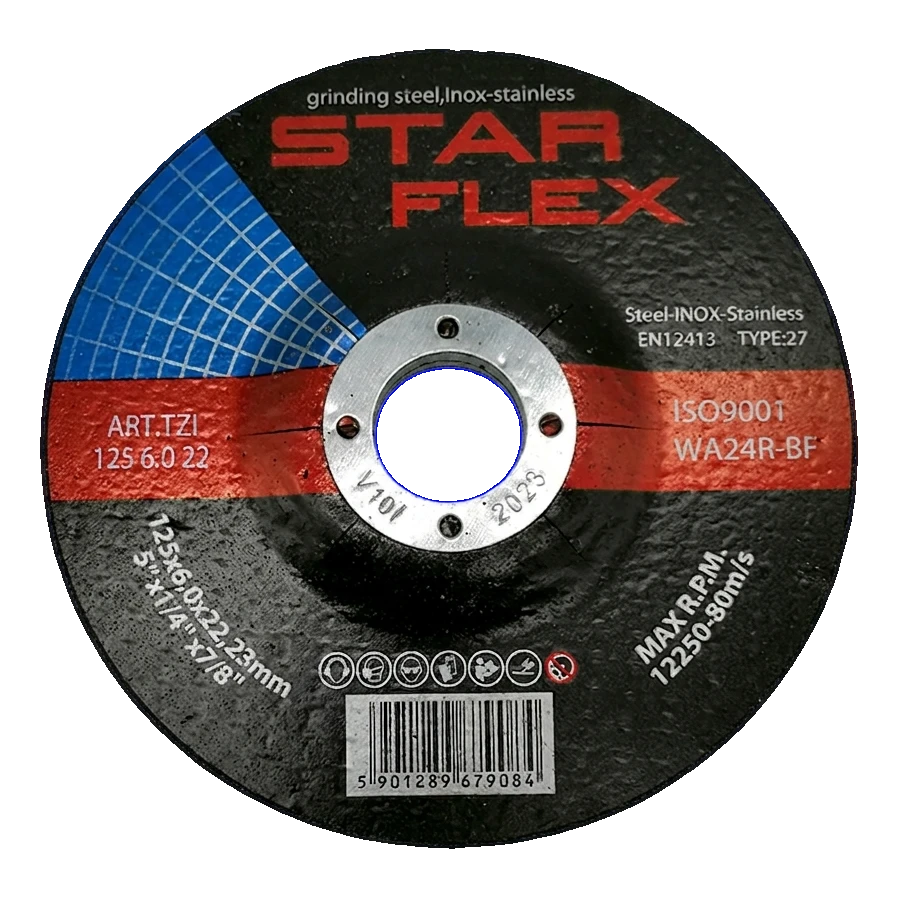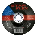 Grovslipskiva StarFlex 125 mm med förhöjd hårdhet, avsedd för slipning av kolstål och rostfritt stål (INOX). Tack vare kornbeteckningen WA24R-BF säkerställer den aggressiv och samtidigt kontrollerad materialavlägsnande — fungerar utmärkt vid bearbetning av svetsar, kantfasning, avgratning och ytslipning. Skiva av typ T27 (med fördjupat centrum) möjliggör bekvämt arbete i vinkel, och förstärkning med glasfiber garanterar säkerhet även vid intensiv användning.