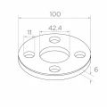 Basen har fyra monteringshål symmetriskt placerade runt omkretsen, vilket möjliggör säker skruvning till underlaget. Monteringshålen kan täckas med speciell täckkåpa, vilket ger estetisk finish utan synliga skruvhuvuden. Det centrala hålet med diameter 42,4 mm är anpassat till standardrör för räcken i systemet 42,4.