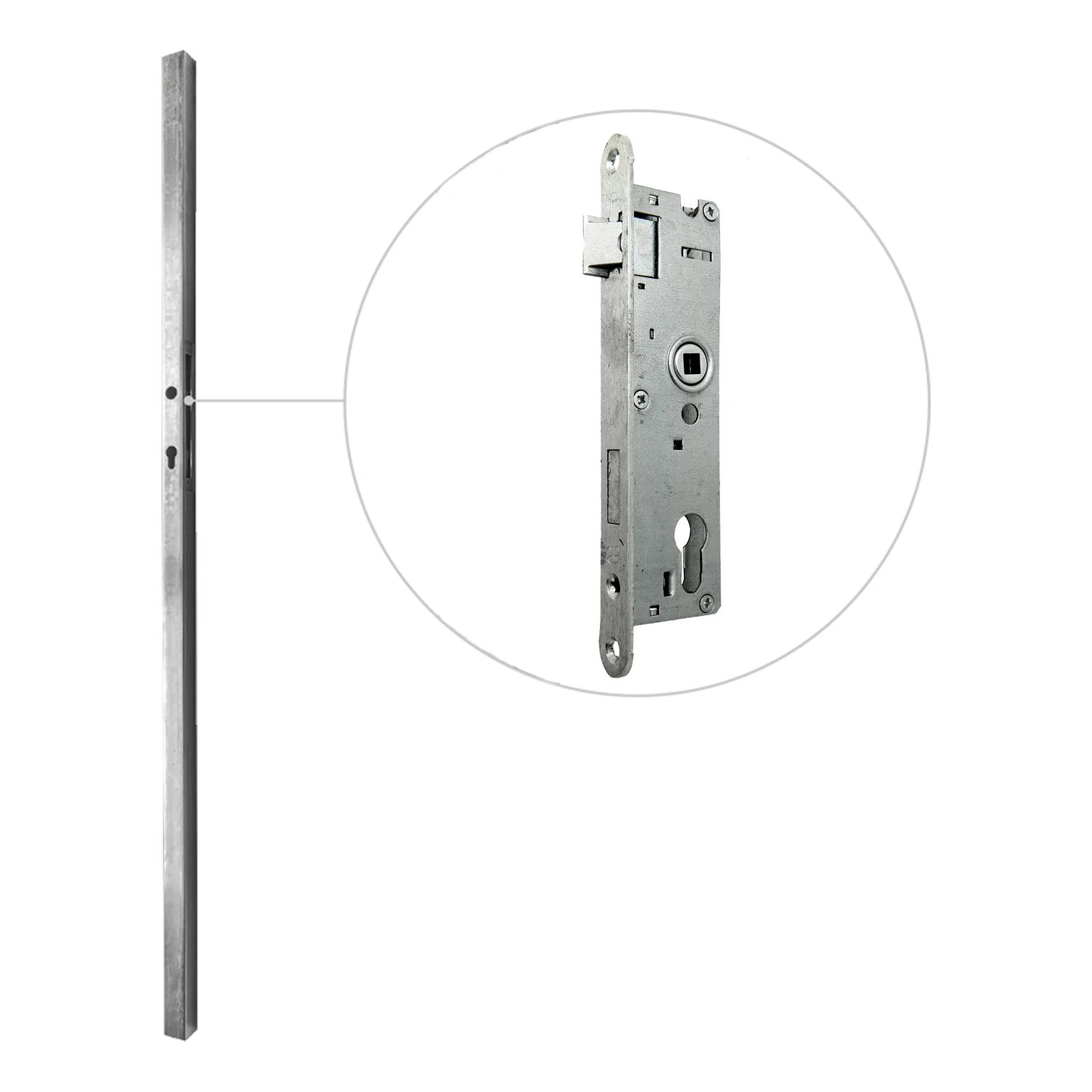 Kassetten som är inbyggd i stolpen fyller en dubbel funktion – den döljer låsmekanismen och skyddar den mot väder och vind samtidigt. Låset är anpassat för en standard cylinderkärna samt ett handtag med spindel på 8 mm, vilket ger full kompatibilitet med populära beslag tillgängliga på marknaden.