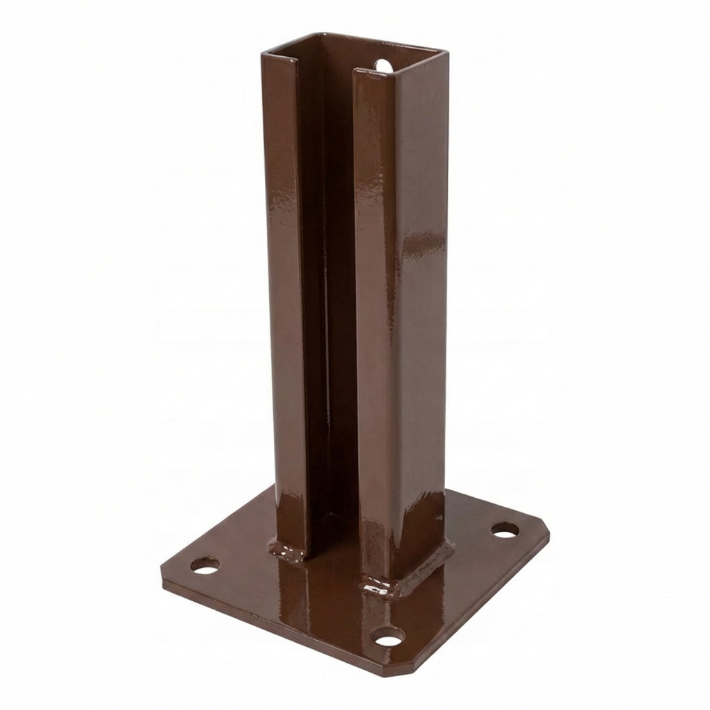 Stolpfot för stängselstolpe 60×40 mm är ett hållbart stålstöd avsett för montering av panelstolpar på betongunderlag. Tack vare galvanisering och pulverlackering i brun färg (RAL 8017) ger produkten effektivt korrosionsskydd och ett estetiskt utseende – perfekt för utomhusbruk.