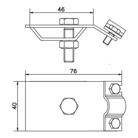 Mått och montering. Kompakt konstruktion (76 × 46 × 40 mm) underlättar montering även på svåråtkomliga platser. Hållaren fästs på rännkanten och sedan dras skruvarna åt — blixtnedledaren blir säkert monterad utan risk för lossning på grund av vind eller vibrationer.