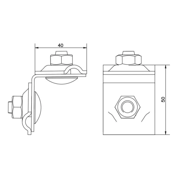 Montering sker med hjälp av två skruvar M10×30 i galvaniserat stål, vilket säkerställer en säker och stabil förbindelse med takunderlaget. De kompakta måtten (40×50 mm) underlättar montering även på svåråtkomliga platser.