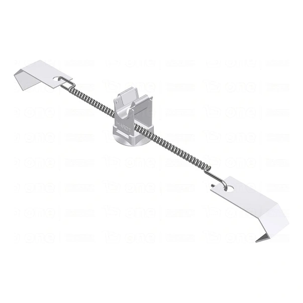 De fjädrande armarna säkerställer säker och stabil montering på nocken, medan det centrala elementet med U-formad hållare säkert håller åskledaren med diameter Ø8 mm. Fästets höjd är endast H=20 mm, vilket möjliggör diskret montering utan att störa takets estetik.