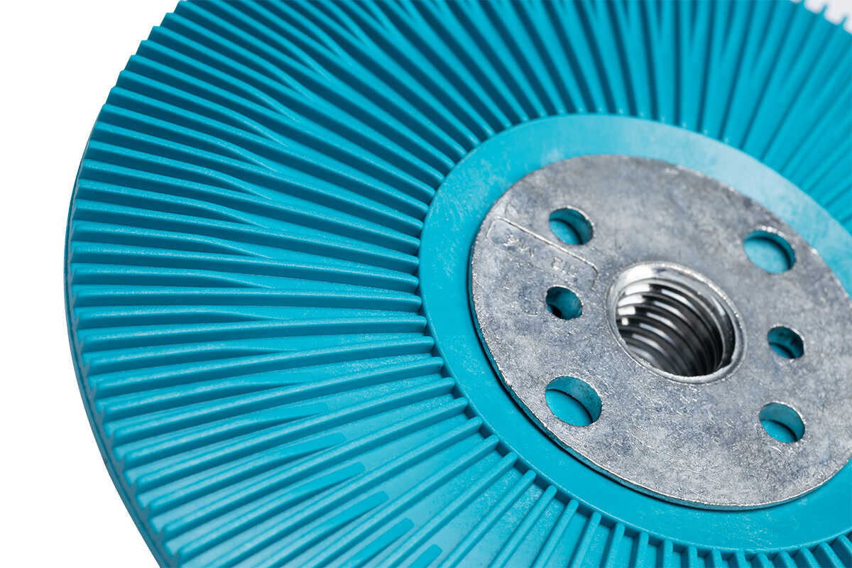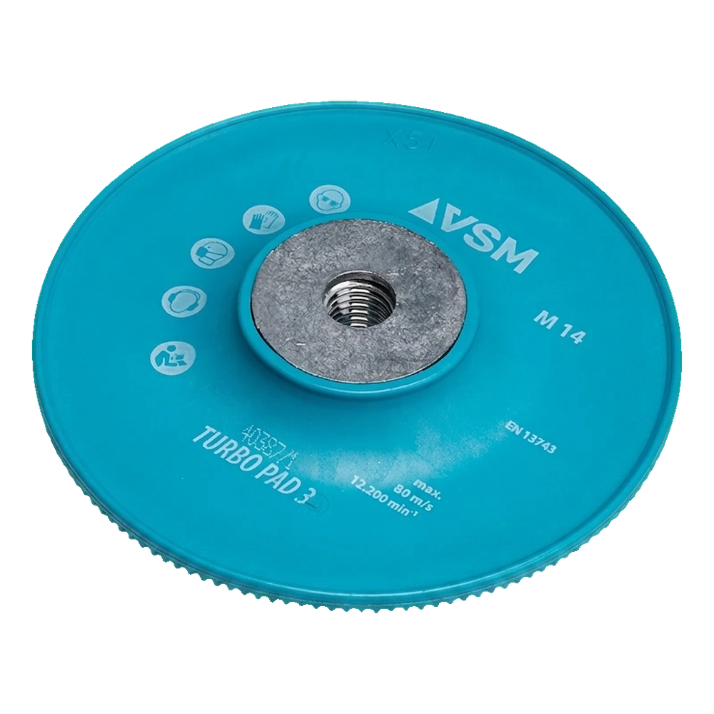 VSM Turbo Pad 3 är en professionell ribbad bricka avsedd för montering av fiberskivor med diameter 125 mm på vinkelslipare med gänga M14. Den unika konstruktionen med radiella ribbor säkerställer effektiv luftcirkulation under skivan, vilket avsevärt sänker temperaturen i slipzonen — förlänger livslängden för både skiva och bricka.