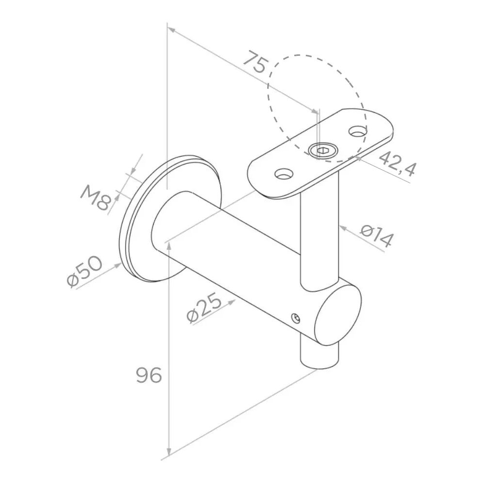 Fästet består av väggrosett med diameter 50 mm, horisontell arm med diameter 25 mm och vertikal stolpe med platt monteringsplåt utrustad med hål för skruvning av handledaren. Monteringsgänga M8 möjliggör säker förankring i väggen. Komponenten fungerar utmärkt som avslutning för glasräcken samt klassiska rörsystem — höjer konstruktionens visuella värden och säkerställer enhetlighet för hela handledaresystemet.