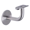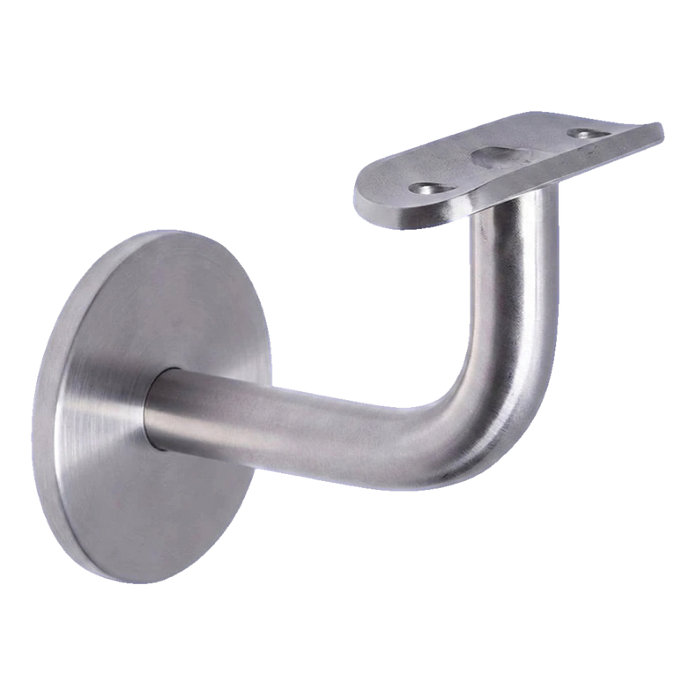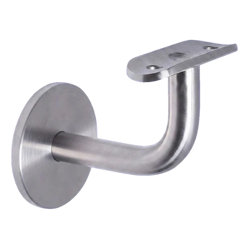 Fästet består av en rund rosett som monteras på väggen, en böjd bärarm samt en monteringsplåt (sadel) som möjliggör fastskruvning av räckesröret. Monteringsplåten med ett monteringshål ingår i satsen. Monteringsskruvar till väggen ingår inte i leveransen — välj dem efter underlagets typ (betong, tegel, gipsskiva).