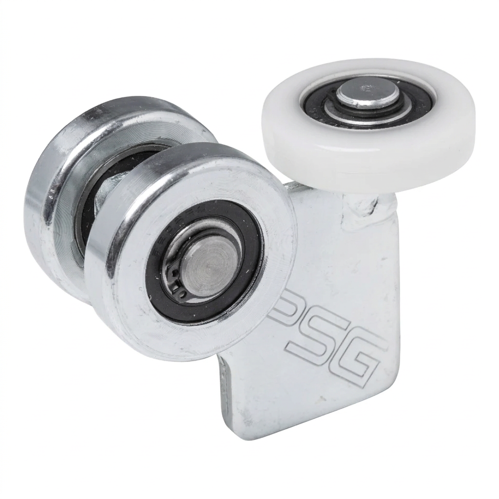 3-hjulsvagn för hängande skjutgrindar — ett precisionstillverkat löpelement konstruerat för användning med styrprofil 60×60 mm. Konstruktionen baseras på två bärande stålhjul och ett styrhjul i plast, vilket garanterar smidig och tyst grindrörelse även vid intensiv användning.