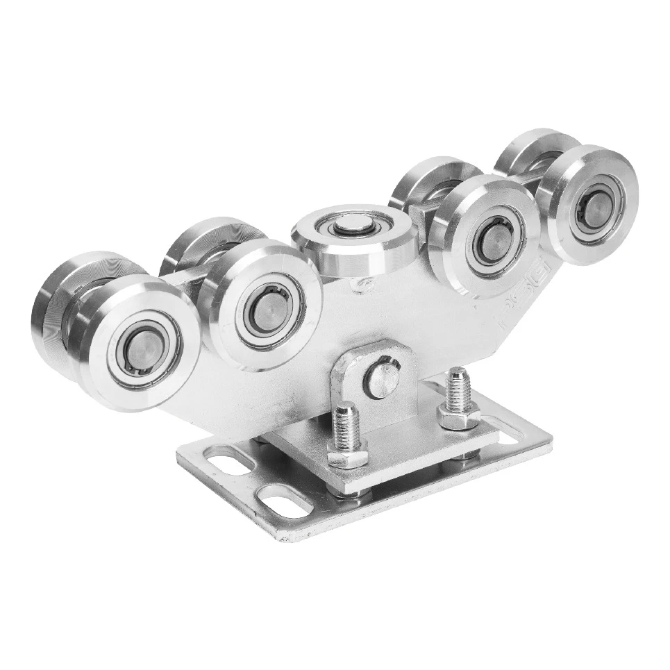 Löpvagnen är utrustad med 9 stålrullar med lager som ger exceptionellt smidig och tyst förflyttning av grinden. Konstruktionen med höjdjustering via skruvar möjliggör exakt inställning av grinden i förhållande till marknivån, vilket ger jämn lastfördelning och minskat slitage på rullarna. Varje löpvagn är anpassad för skenor med måtten 80×80×5 mm och tål en belastning på upp till 1 000 kg.