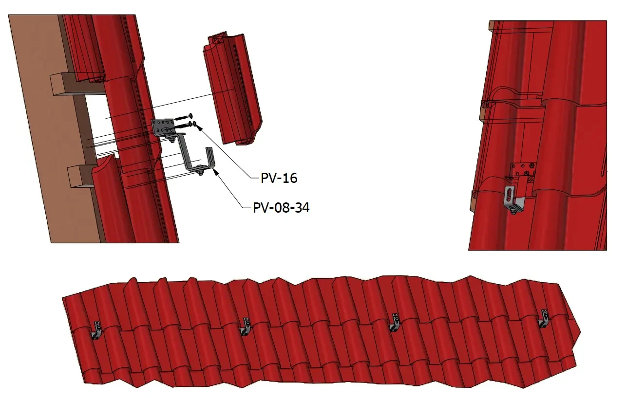 Vario takkrok för montering av profiler till solcellssystem på tak täckta med keramiska och betongtakpannor. Säkerställer stabilitet för hela konstruktionen.