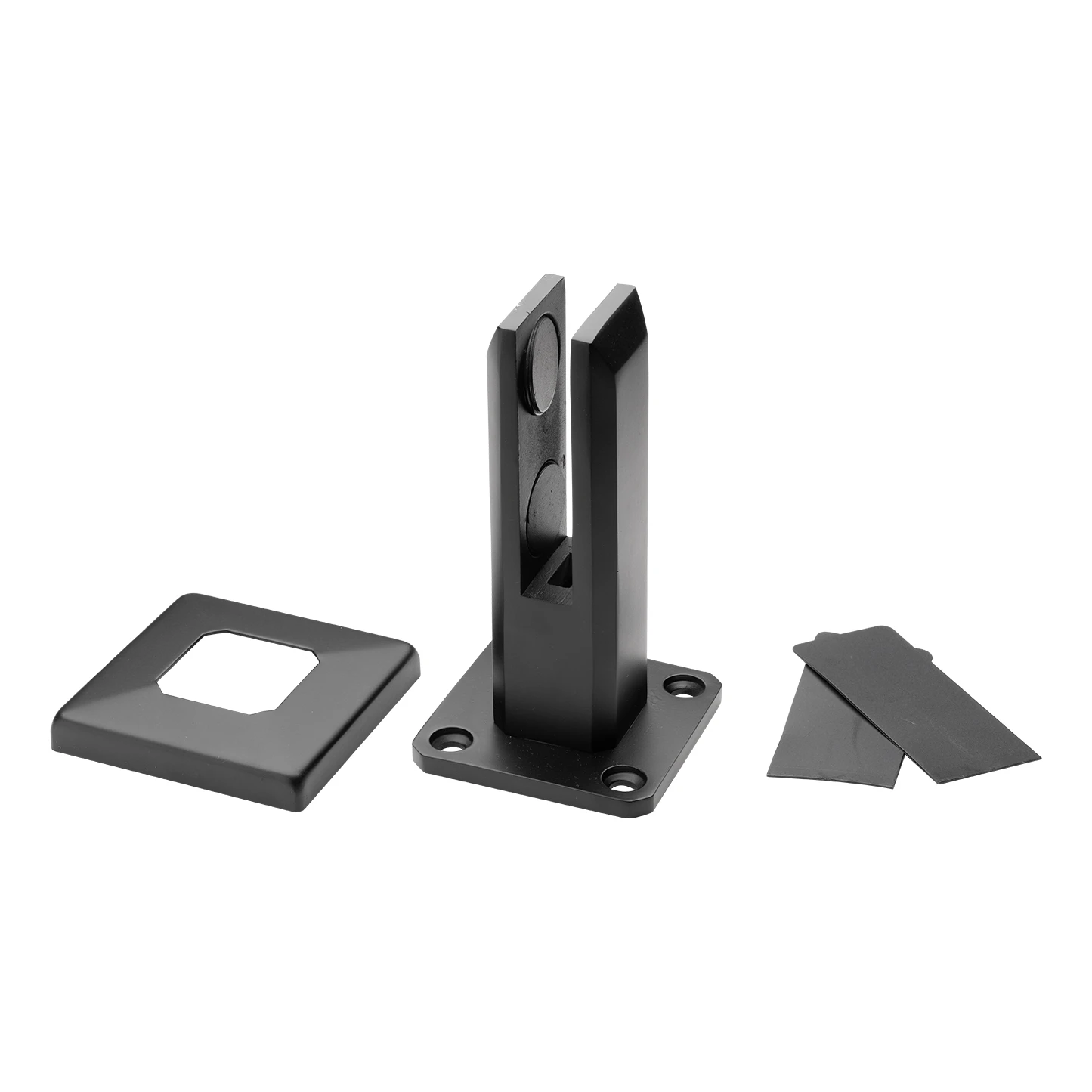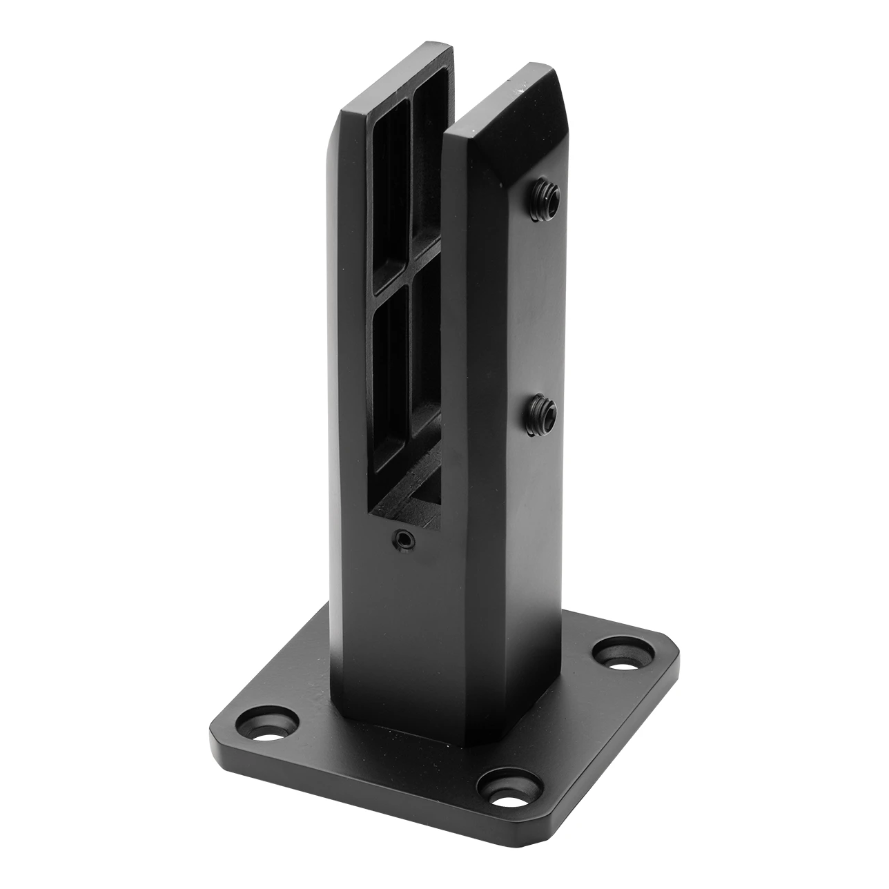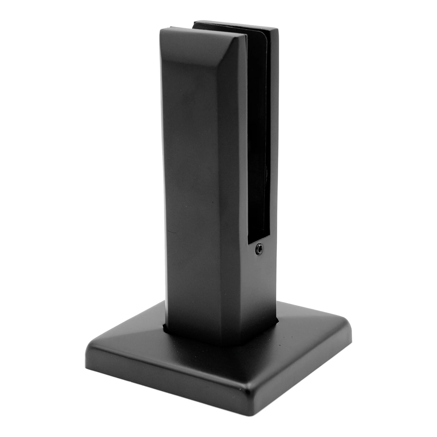 Vertikal glasshållare av spigot-typ i färgen mattsvart — en stabil och estetisk bas för glasräcken, terrassavskärmningar och staket. Tillverkad av rostfritt stål AISI 304 och belagd med svart pulverlack, ger den ett varaktigt korrosionsskydd både inomhus och utomhus.