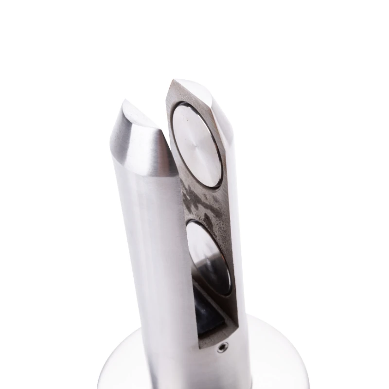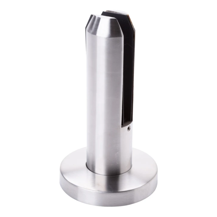 Den övre delen av infästningen är försedd med en delad spindel med två klämkäftar, mellan vilka glasskivan placeras. Inuti spåret sitter gummitätningar som håller glaset säkert på plats och skyddar det mot repor. Tack vare detta överför konstruktionen belastningar effektivt och garanterar säker användning.