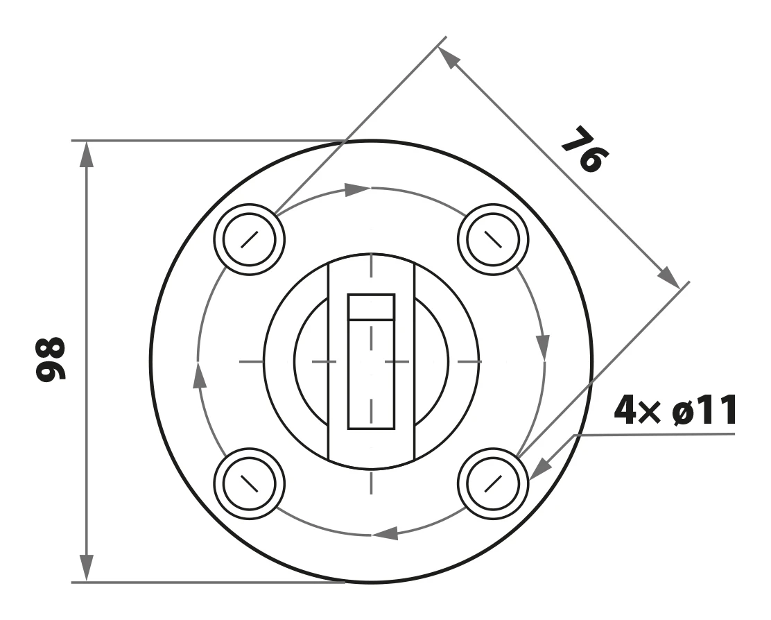 Den runda monteringsbasen har 4 monteringshål med diameter ø11 mm placerade på en bultcirkel med delningsdiameter 76 mm, vilket möjliggör ett säkert och symmetriskt skruvfäste i underlaget. Den medföljande täckbrickan döljer skruvhuvudena och ger ett elegant, färdigställt utseende.