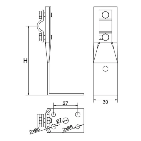 Monteringsplåtens mått är 27×30 mm, och monteringshålen med diameter Ø5 och Ø6 mm möjliggör flexibelt val av fästelement för olika typer av underlag. Genomgående hål Ø7 mm ger ytterligare användningsflexibilitet.